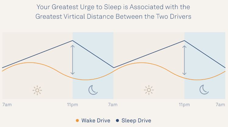 Whenever we are awake, a neurotransmitter called adenosine accumulates in our brain, as a by-product of brain cells firing. Adenosine molecules bind to receptors, slowing the brain cells down, making us feel sleepy. You can imagine this process as an hourglass that fills up during the day, increasing our drive to sleep, then flips over and empties overnight. In contrast, our body clock, which completes a cycle once every twenty-four hours, influences our drive to stay awake. Our sensations of sleepiness or alertness are the outcome of the interaction between our sleep drive and wake drive.